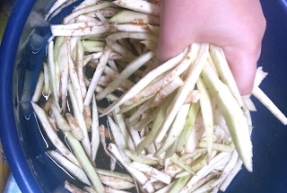 Retire a casca da berinjela e corte-a em tirinhas (não muito finas, nem muito grossas) de aproximadamente 4 dedos de comprimento. Deixe as berinjelas em um recipiente meio fundo e cubra-as com água e um punhado generoso de sal. Pode deixar de molho por uns 30 minutos.